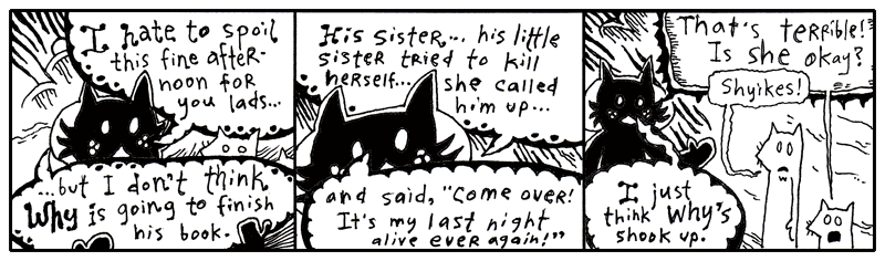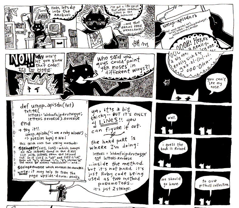 why the lucky stiff, or _why, was a pseudonymous artist and programmer active in the 2000s. His output was extremely varied: software, of course, but also stories, music, comics, and poetry. His most renowned work was Why’s (Poignant) Guide to Ruby, an eccentric e-book teaching beginner programmers the Ruby language. it’s something like what would happen if Lewis Carroll wrote a programming book, and was also a cartoonist. It even has a soundtrack album recorded by _why and friends. I learned Ruby as a teenager; it was the first language I felt I truly understood, and _why and the Poigant Guide were a big part of that.